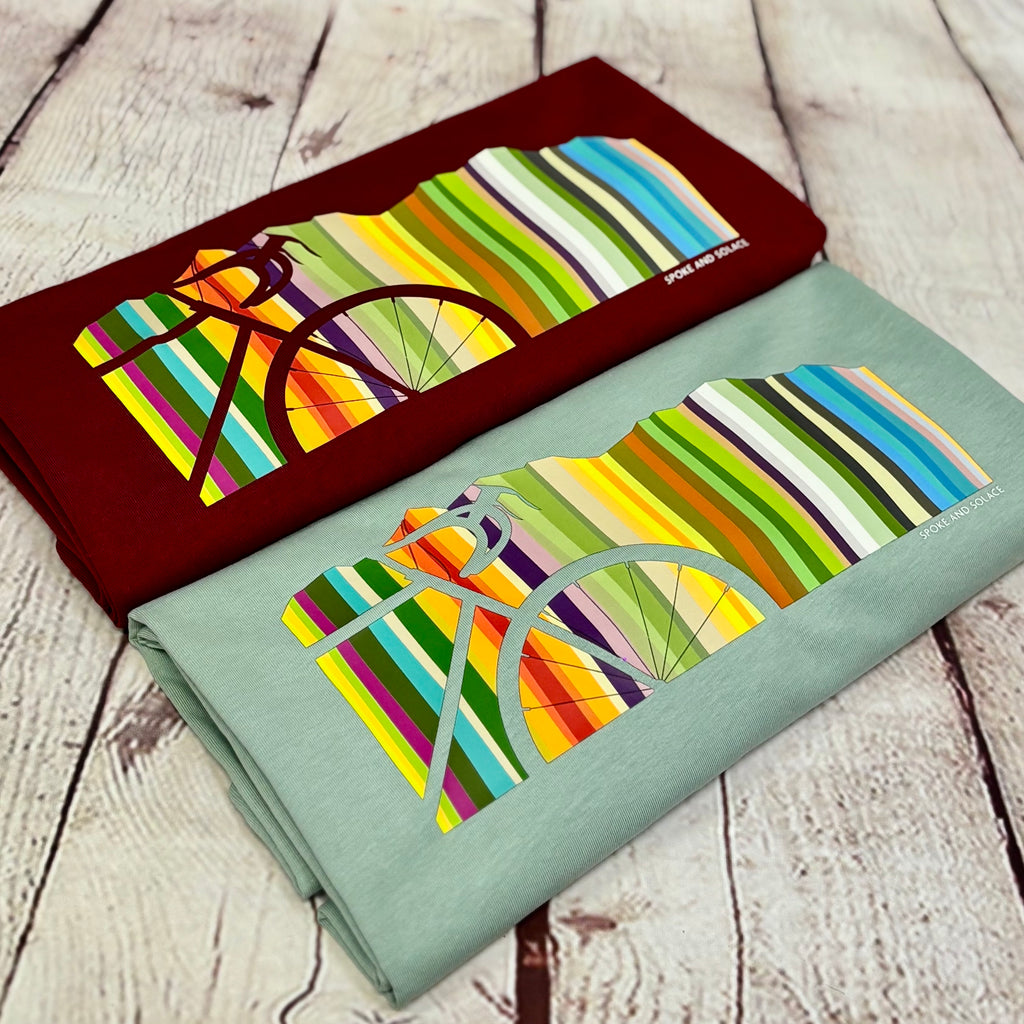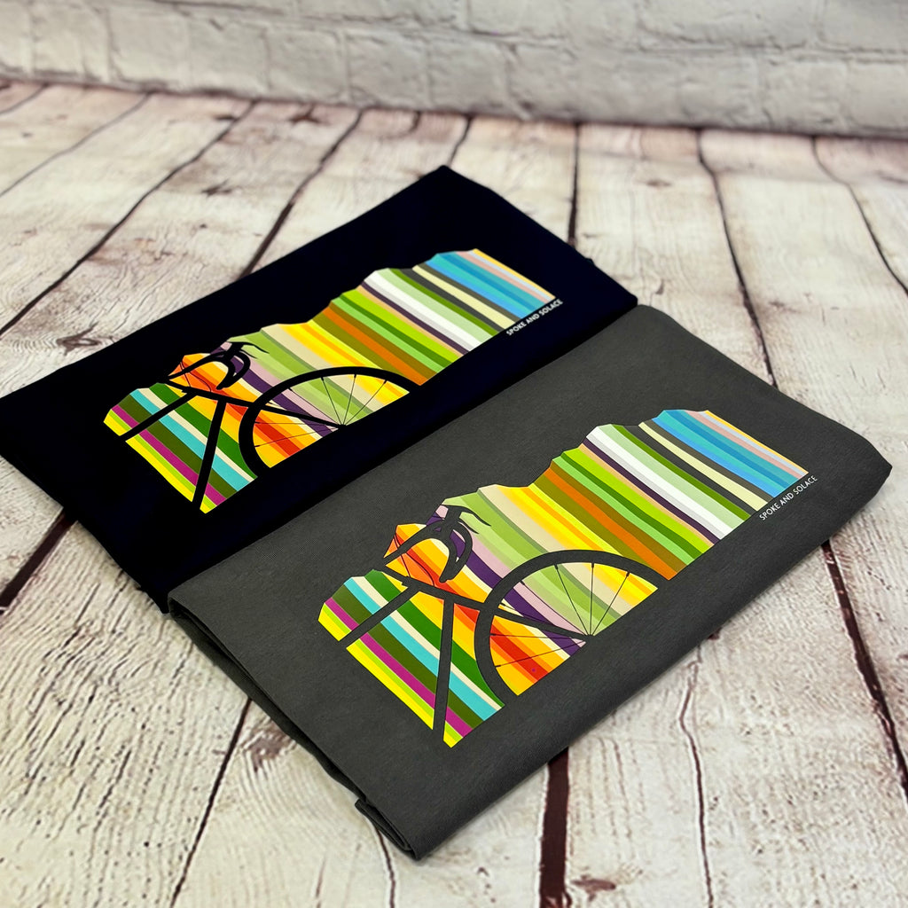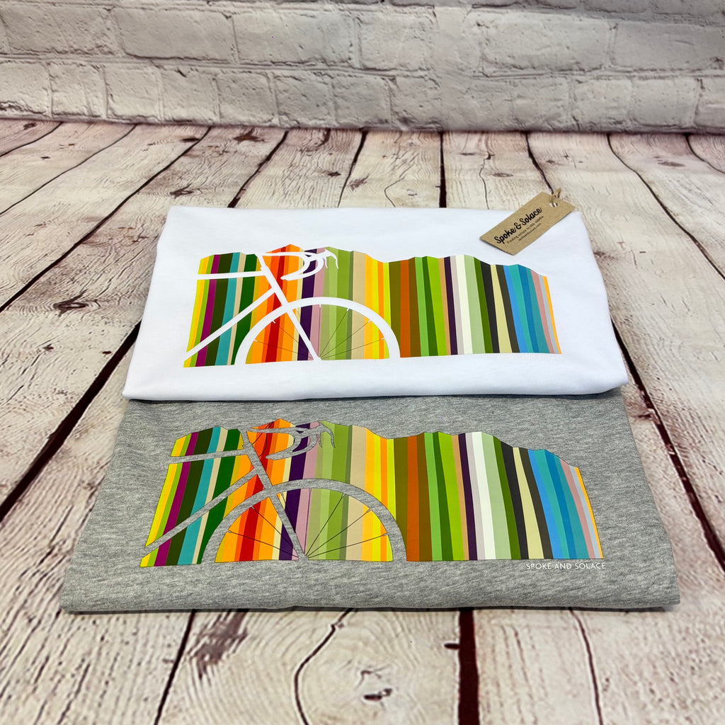 Rolling hill colourful spectrum with bike silhouette makes a bold, but stylish statement on a tee.  High end style and quality, with a bit of a Paul Smith edge.