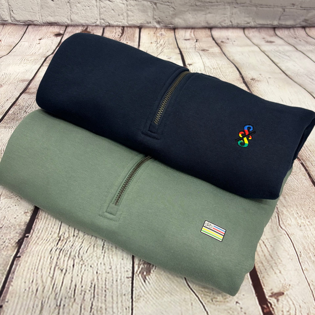 Our 1/4 zips are 350gsm crafted from premium organic cotton.  85% organic cotton, 15% recycled polyester.