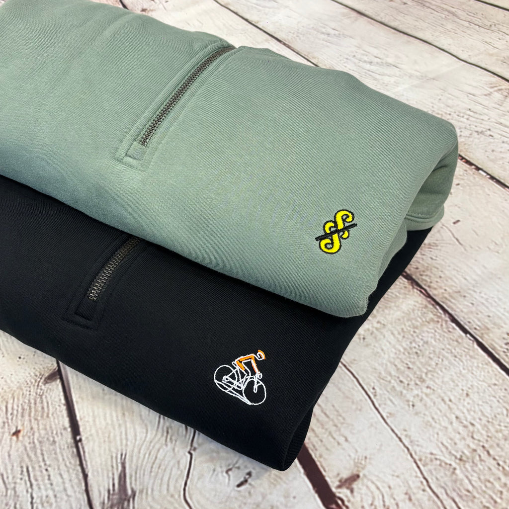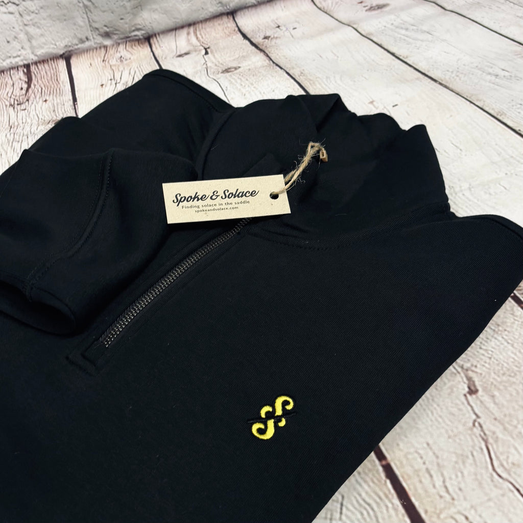 Our Spoke and Solace subtle SS logo embroidered left chest in yellow and black - subtle nod to the tour leader on a stylish 1/4 zip sweatshirt.