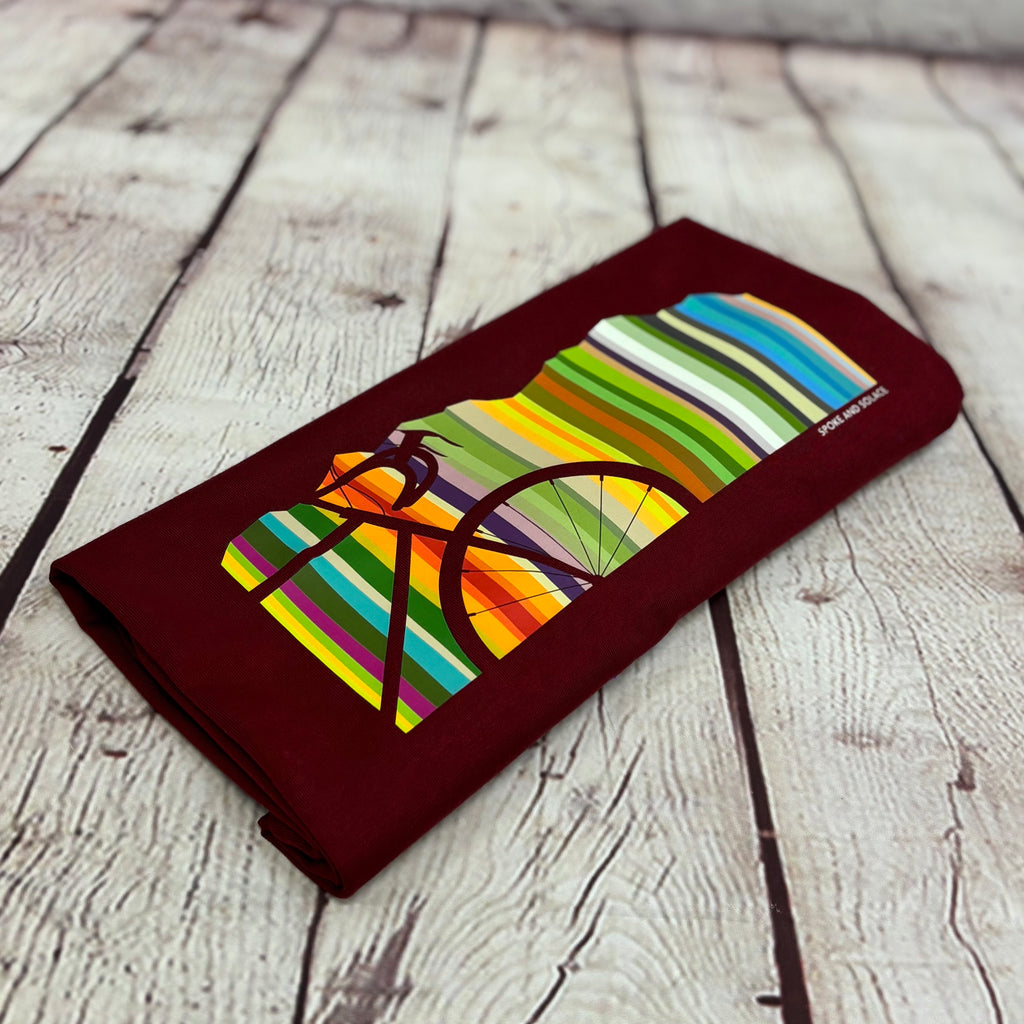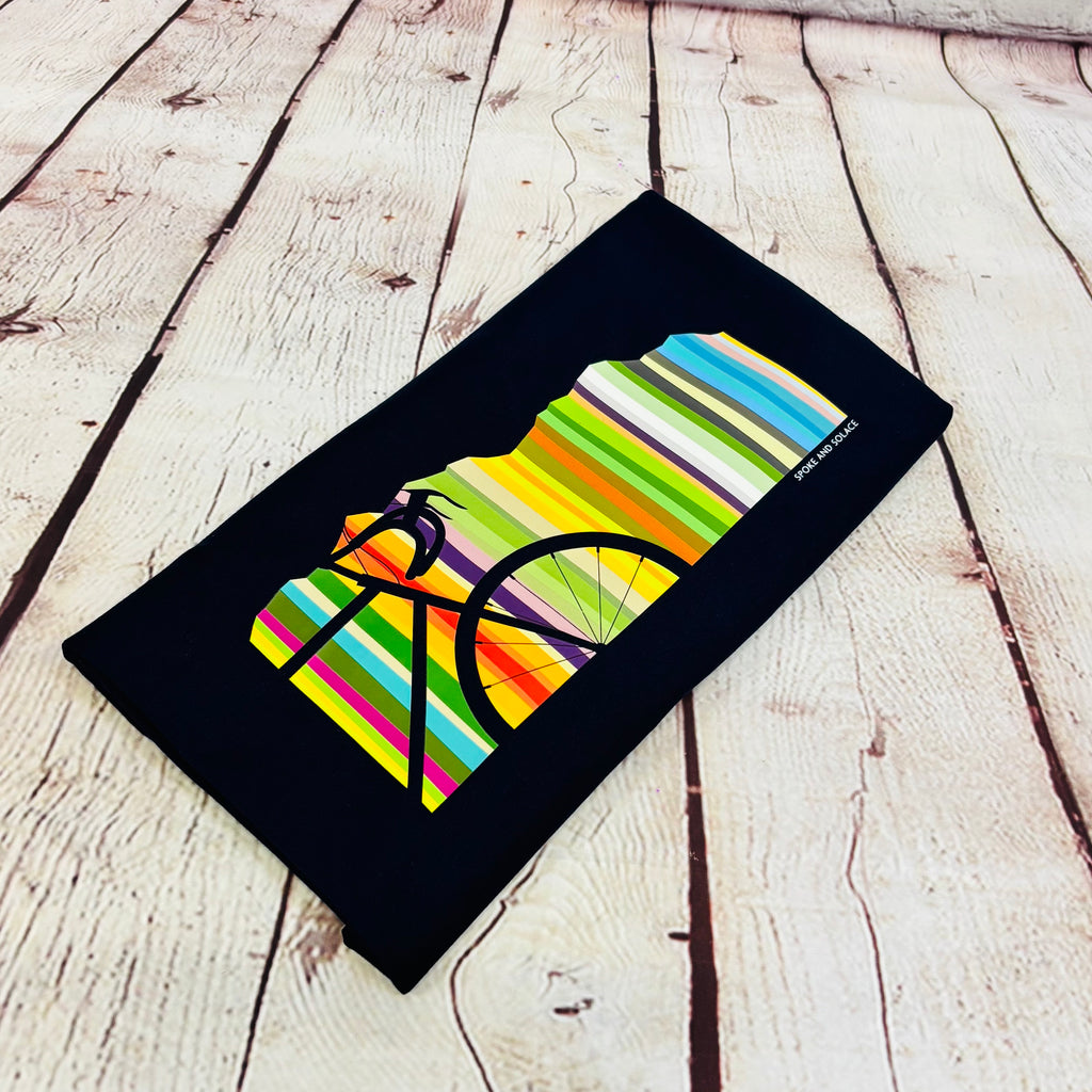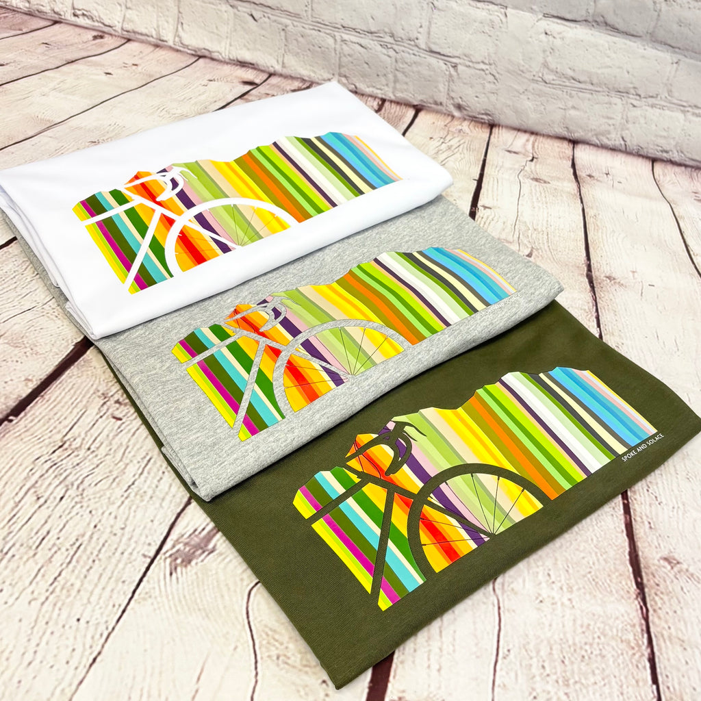 Rolling hill colourful spectrum with bike silhouette makes a bold, but stylish statement on a tee.  High end style and quality, with a bit of a Paul Smith edge.
