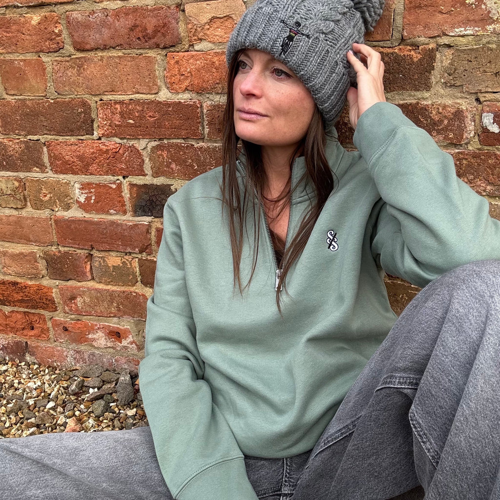 Our Spoke and Solace subtle SS logo embroidered left chest in white and black on a stylish 1/4 zip sweatshirt.
